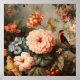 A vibrant and detailed depiction of various flowers in full bloom accompanied by colorful birds. The composition includes rich textures and intricate patterns, creating a harmonious balance between flora and fauna.