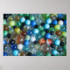 Fotografia macroscópica de muitas bolas de vidro que repousam em água rasa, dentro com uma panela de alumínio esmagada.