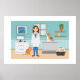 A ilustração fofa original de Destei de uma mulher veterinária que se encontra numa sala de exames de uma clínica veterinária. A veterinária está vestindo um casaco de laboratório branco, esfregões azuis e ela tem um estetoscópio em volta do pescoço. A mulher veterinária tem cabelos castanhos longos e expressão de rosto sorridente. A sala tem uma mesa de exame de cinza e um tórax branco de gavetas com uma tela de computador e mouse sobre ela. Na parede, há duas prateleiras flutuantes castanhas com uma planta de folha verde e dois pequenos frascos de remédios colocados nelas. Há também uma janela e um raio-x do esqueleto de um cão e alguns ossos. No chão há uma caixa portátil de transporte de animais de estimação em cor bege. Um cachorrinho castanho e branco está sentado na mesa de exame enquanto um gato laranja se senta no chão ao lado do veterinário.