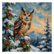 A serene vintage-style Christmas painting of a barn owl on a frosty fence post, surrounded by holly and evergreens. A peaceful scene that evokes classic winter tranquility.