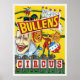 Poster de publicidade da Vintage para Bullens Circus, Austrália. Publicado nos anos 30. Observe que nossos posters são reproduções de alta qualidade baseadas em exames profissionais de alta resolução dos originais. Nosso processo de retoque manual não envolve o uso de filtros que removem qualquer detalhe ou textura original que você verá nos impressões originais. Todos os detalhes permanecem intactos. Cores corrigidas. Imperfeições removidas. Imagem cortesia da Biblioteca do Congresso.