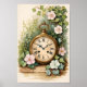 "Uma pintura aquosa vintage de um jardim com relógio antigo cercado por mariposa e flores macios. O relógio deve evocar nostalgia, com tons sutis de ouro e verde macio, criando um ambiente de eterno e chique."