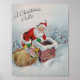Vintage cena de Papais noeis e seu saco de brinquedos em um telhado pronto para descer pela chaminé...O texto diz "A Christmas Hello poster" (Um de Natal de Alô).
