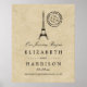 Esta poster de boas-vindas é perfeita para qualquer casal planejando uma celebração romântica de casamento vintage. O design apresenta um fundo de estilo antigo com uma torre Eiffel de tinta preta e um carimbo postal. O design simples pode ser personalizado para se adequar ao seu evento especial e será o sinal perfeito de boas-vindas para qualquer festa temida, incluindo chás de panela, noivados, chás de casamento, festas de aniversário e muito, muito mais.