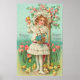Menina da era vitoriana com pintinhos num cartão de saudação de Páscoa do século XIX.