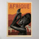 Um poster de viagens de estilo antigo ilustrado com beleza, com uma mulher tribal africana e um grupo de zebras contra um pôr do sol africano. Cores naturais, incluindo o laranja e o castanho retrógrado