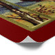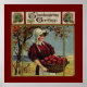 This vintage Thanksgiving design is of a young colonial girl in a red dress with a white apron and bonnet. She is standing in front of a tree with mountains far in the background. She is carrying a basket full of ripe red apples off to the kitchen to back some fresh apple pies. Above her the words Thanksgiving Greetings are flanked by tom turkeys on either side. It's a beautiful vintage design perfect for all your Holiday Dinner invitations, cards, aprons and more. Match this poster with the other products that have this vintage art design.
