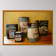 Uma série de antigos jarros de estanho anunciando leite, talheres e latas de chocolate - a vida estática perfeita para uma cozinha ou área de jantar, e para pessoas que amam nostalgia, estilo country e aparência vintage.