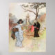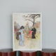 Uma bela coloração d'água vintage decoração artística japonesa, representando uma cena de conto de fadas de uma mulher em um quimono e uma personagem de bruxa ou figura escura virada para fora no meio de um campo.