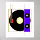 En stiliserad vinylskiva är mittpunkten i en grafisk komposition, flankerad av högtalare i en blå nyans och en tonarm i röd nyans. Designen är inkapslad i en vit kant och ställs mot en neutral vit bakgrund, som projicerar en modern, minimalistisk atmosfär.