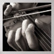 Esta pintura de óleo hiperrealista feita por Jeff Bartels mostra um homem tocando violino. A imagem bem cortada, preta e branca olha para o pescoço do violino com a mão do violinista em primeiro plano. Luz forte e sombras junto com a perspectiva extrema dão a esta pintura uma sensação impressionante e dramática.