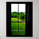 Uma imagem da terra verde em volta da terra norueguesa, Norskadalen, de dentro a uma casa histórica.