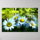 É um dia brilhante e ensolarado. Cinco margaridas selvagens com polos amarelos alegres e pétalas brancas estão no primeiro plano. Uma lagoa cintilante cercada por arbustos e árvores verdes está à distância. Alguém pode percorrer e pegar cada pétala enquanto diz "ele me ama, ele não me ama".