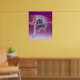 Beleza seu estúdio de yoga ou sala de meditação com essa visualização mostrando as chakras e a sushumna sobreposta na silhueta de uma pessoa em "pose de camelo", ou "ustrasana", flutuando em uma radiância de pulsos roxos, azuis e brancos mostrando as linhas conceituais da pose, e a atenção da mente direcionada para o ponto de desaparição a postura. Alta resolução, detalhes extremos, funciona em todos os tamanhos.