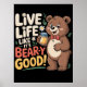 Esta ilustração encantadora apresenta um urso marrom alegre, com uma gravata vermelha de arco, segurando um boião de mel ouro. O urso tem um sorriso largo, feliz, exuberando positividade. O texto "VIDA AO VIVO" é exibido acima do urso em branco, adornado com pequenos sotaques florais, enquanto "COMO É" em branco leva ao brincalhão "BEAR-Y BOM!" numa mistura de azul claro e laranja. Folhas verdes e sutis florescem acrescentam ao tema natural e alegre, fazer este design um doce lembrete de abraçar a bondade da vida.