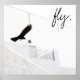 Corvo americano voando contra uma paisagem branca, com a palavra "mosca".