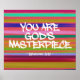 Este design de inspiração cristã diz "Você é a obra-prima de Deus" e é inspirado pelos efesianos 2:10 que diz "Porque nós somos a obra de Deus, criada em Jesus Cristo para fazer boas obras, que Deus preparou antecipadamente para nós". Esta citação cristã é escrita em letra de tipo grafite sobre uma textura falsa horizontal pintada por uma mão que tem um fundo cor-de-rosa com linhas aqua, amarelas, azuis, roxas, verdes e burgundy. Ideia perfeita para uma adolescente cristã, mulher cristã, pastora feminina, artista religioso ou qualquer cristão.