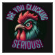 Um galo de cores brilhantes aparece com uma expressão de descrença, cercado pela frase "Você Está Clucking Serious!" em letras negrito. O design usa cores vibrantes contra fundo escuro para criar um efeito marcante e humorístico.
