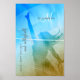 Este poster de vôlei de praia feminina apresenta uma cena conceitual de um jogo de vôlei na praia, com texto personalizado que diz: "areia, surf e céu.. e vôlei" - gráficos combinados de vôlei incluem vôlei e salto de vôlei feminino em uma rede de vôlei sobreposta a um gradiente diagonal de turquesa, branca e castanha clara que representa um céu azul claro, o surf oceano e uma praia arenosa - personalize com seu monograma e nome - por katz_d_zynes