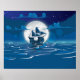 Voo de navio Wooden Sail à lua - Pequeno navio de madeira bonito navegando sob a lua à noite, navio de cartoon à noite.