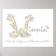 Arte decorativa de rabiscos, pôster com monograma da letra W perfeito para o quarto ou sala de brincar de uma menina em tons de cinza, branco, amarelo, rosa e roxo. Personalize com o nome da sua filha que comece com a letra W e o significado do nome para um presente verdadeiramente único para o quarto ou berçário da sua criança, este exemplo é para o nome Winnie "Uma amiga justa da paz e da reconciliação abençoada". Impressão de pôster fofo ideal para presente de um novo bebê, batizado ou chá de bebê. © Desenho e design de arte gráfica de monograma da letra W com corações e flores por Sarah Trett. www.sarahtrett.com para www.mylittleeden.com