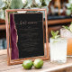 An elegant sign for your wedding bar menu. The words "bar menu" appears in dusty rose handwriting calligraphy with swashes at the beginning and end, with customizable text below. A burgundy red watercolor agate design trimmed with rose gold faux glitter decorates the left border on a slate black background. See our collection for matching wedding invitation suite and day-of stationery.