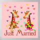 Duas girafas bonitinhas seguram buquês de flores à medida que corações coloridos arco-íris as cercam. Igualmente adorável para um ensaio de gay ou hetero, cerimônia informal e recepção.