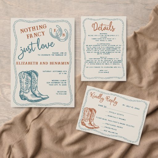 Simple rustic hand-drawn western style wedding design with rope frame, cowboy boots, and a horseshoe monogram, for a casual wedding or elopement celebration.