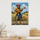 Este charmoso trabalho de arte apresenta um urso vestido de bombeiro, cheio de capacete e óculos de sol, tocando uma guitarra acústica enquanto sentado numa velha roda de vagão de madeira num prado ensolarado cheio de flores silvestres. Um pote de mel fica perto. O céu é azul com nuvens fofinhas, e as árvores são visíveis a distância. A pintura usa pinceladas grossas, texturizadas, dando uma sensação caprichosa e entusiasmante, com "Love My Honey" escrito abaixo.