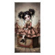This whimsical dark circus doll illustration captures the mysterious charm of a vintage carnival. With her large expressive eyes, flowing red curls, and striped Victorian-style dress, the doll sits quietly atop a travel trunk surrounded by circus tents, bunting flags, and nostalgic stage props.