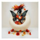 This whimsical flower fairy illustration captures the magic of fantasy and nature in a graceful, dreamlike style. The fairy wears a vibrant dress made of blooming flowers in warm autumn tones, beautifully contrasted by dark, elegant butterfly wings.