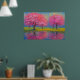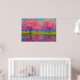 A symphony of spring unfolds in this impressionistic landscape, where blooming cherry blossoms shimmer in hues of pink, crimson, and violet. Their delicate forms stretch skyward, mirrored in the still waters below, creating a dreamlike duality. The golden sky—caught between sunrise and memory—casts a gentle glow across the meadow, where red and yellow wildflowers whisper in the breeze. Birds drift silently overhead, adding motion to the stillness, presence to the peace. This piece invites quiet reflection, evoking the fleeting beauty of light, nature, and time suspended.