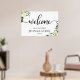 Um poster de boas-vindas ao design floral branco. A armação e a exposição num cavalete para uma elegante adição à vossa decoração de entrada de casamento.