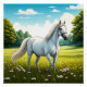This colorful poster shows a white horse standing in a field of grass, with wild flowers and trees. A great gift to decorate your wall, for all horse, mammal, and animal lovers.