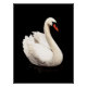 A graceful white swan painted in soft watercolor tones against a deep black background.
