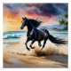 Black stallion horse galloping on the beach, beautiful watercolor painting.