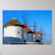 Moinhos de vento do século XVI e construções clássicas de lavagem branca revestem as ruas labirínticas da ilha Mykonos, Grécia.