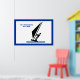 Windsurfer em conselho de windsurf preto-poster azul, exibindo um ícone de pictograma minimalista de um surfista da silhueta preta e seu texto sobre fundo branco com borda azul.