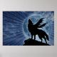 Um lobo alado uivando na lua. Feito com Photoshop.