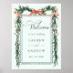 This wedding welcome sign (poster) features a watercolor winter greenery garland adorned with pine branches, holly berries, botanical foliage, red ribbon bows, and elegant calligraphy. For more advanced customization of this design, please click the BLUE DESIGN TOOL BUTTON above! Matching items are also available.