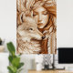 Uma ilustração colorida de lápis mostra uma mulher com cabelo vermelho longo e fluido e um lobo branco. Os olhos da mulher estão fechados, e ela tem sardas no rosto. O lobo está aninhado contra ela, sua cabeça repousa sobre seu ombro. Tanto a mulher como o lobo estão rodeados por um delicado padrão de penas, criando uma atmosfera macia e etérea. Presente perfeito para amantes de lobos.