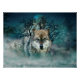 Lobo Bonito numa Noite Foggy com uma Arte de Lua Cheia. Com tons azuis e árvores nas costas. Wolf art com imagem de foto vívida de cores azuis.