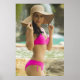 A swimsuit model poses in a bright pink bikini, holding a straw hat by a waterfall. The background showcases blurred water and natural stones.