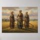 Three women stand in a golden wheat field, holding traditional scythes. The sky is filled with fluffy clouds, suggesting a warm day.