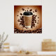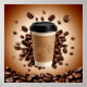 Uma xícara de café descartável para viagem flutua no centro, cercada por ricos grãos de café. A energia quente inspirada em cafés evoca rotinas matinais, cultura de levar e momentos de bebida aconchegante.