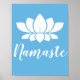 Yoga poster featuring a white lotus flower silhouette and the word "Namaste" in white script over a calming blue. Hang up in your yoga studio for a truly zen accent.