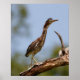 A bird with a long neck and sharp beak stands on a branch, gazing into the distance. The background is blurred, bringing focus to the bird's detailed plumage and intense expression.