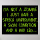 Onde quer que você vá, as pessoas lhe dizem, "Você parece um zumbi." E isso é ruim porque se os mortos-vivos realmente dominarem o planeta, você será confundido com um deles. Mas não se você estiver exibindo esta design de salvação. Ele explica a verdade para qualquer caçador de zumbis: Eu não sou um Zombie. Eu só tenho um Impedimento de Fala, uma Condição Cutânea e uma Perna Má. O texto é verde-malhado, como carne de zumbi, e o fundo é preto. Esteja preparado quando o surto ocorrer. Veja em mais produtos sob o "Halloween" em nossa loja.