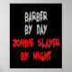 Este estranho design de texto com a citação "Barber by Day Zombie Slayer by Night" em escrevendo vermelho de sangue, é perfeito para qualquer barbeiro que ame zombies.