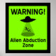Aviso - Zona de Rapto de Alienígenas - sinal de aviso em verde e preto com a nave espacial.